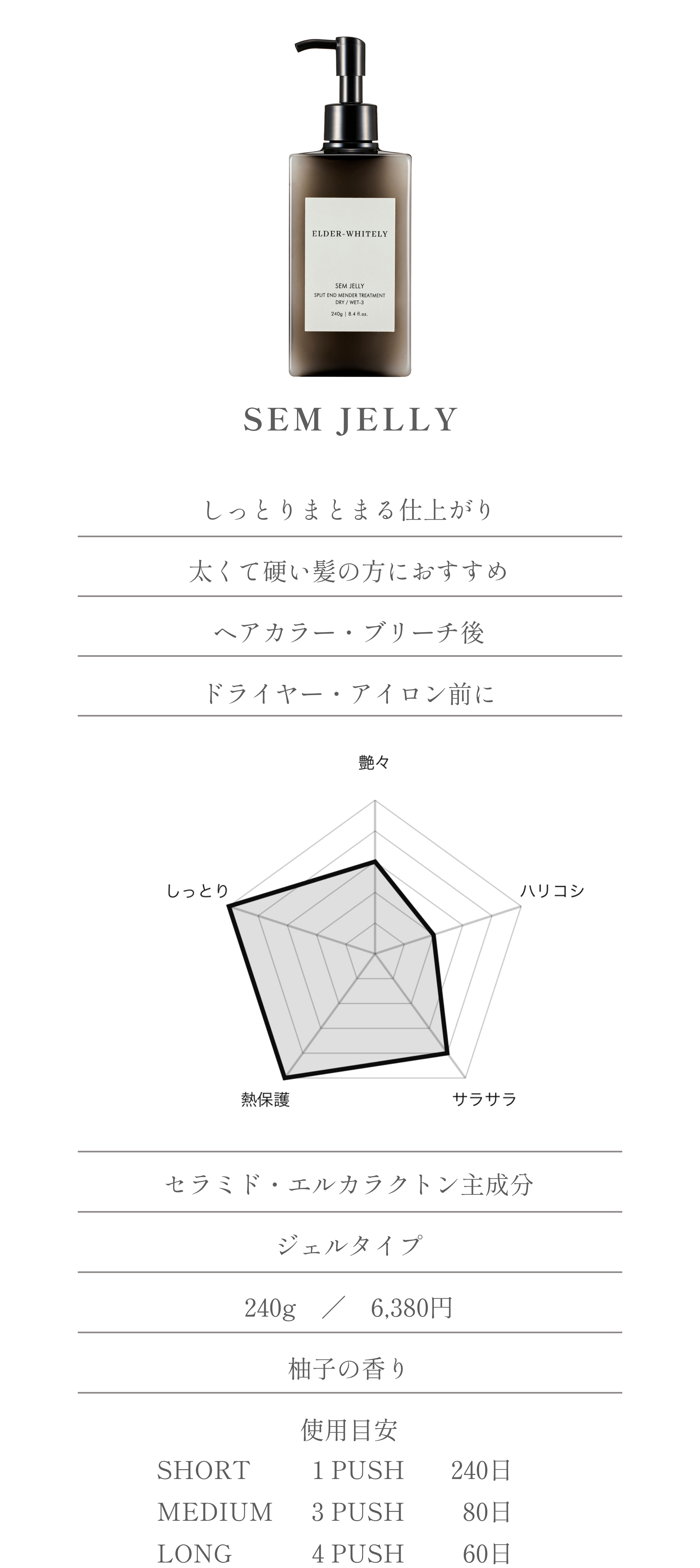 全アウトバス配合のセラミドが、さまざまな髪トラブルの根源となるキューティクルを保護。さらに髪の水分保持、髪内部への浸透によるダメージ修復、髪の強度向上の効果により、複合的に髪を補修します。